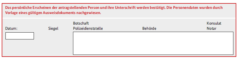 Im roten Kasten unterhalb Ihrer Unterschrift bestätigt die Amtsperson, dass wirklich Sie selbst den Antrag unterschrieben haben und die Übereinstimmung der Daten im Formular mit Ihrem Reisepass.