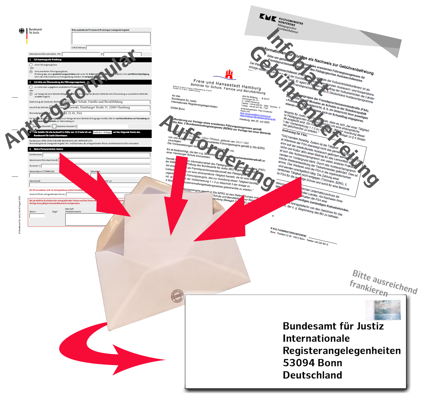 - Senden Sie den Antrag ohne amtliche Bestätigung an das BfJ und fügen Sie zusätzlich zu den oben genannten Dokumenten eine beglaubigte Kopie Ihres Reisepasses bei.