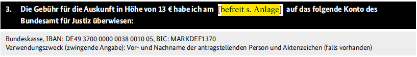 Im Formular werden Sie aufgefordert, die Gebühr für die Ausstellung des eFZ an das Bundesamt für Justiz (BfJ) zu überweisen. Als FSA sind Sie von der Zahlung der Gebühr befreit – bitte überweisen Sie daher kein Geld. Im Formular ist bereits vermerkt, dass Sie von der Gebühr befreit sind.